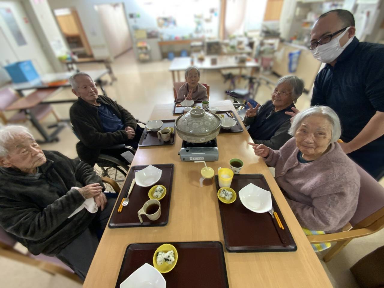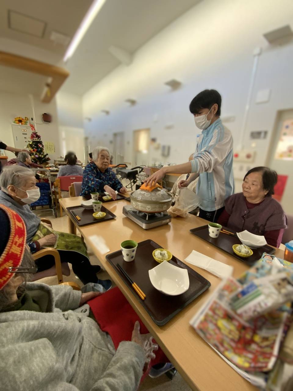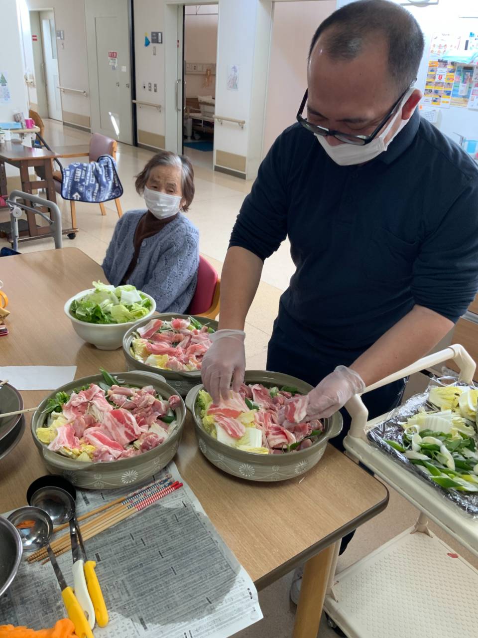 老健「鍋をしました」 2025/05/07 鍋をたべました 老健さわやか荘 遅くなりましたが、令和6年年末のレクリエーションを掲載します。 寒い時期に暖かいものを食べてもらおうと鍋レクを実施しました。 利用者様には野菜を切ってもらいました。 久しぶりの鍋レクで皆さん喜んで食べられていました。 職員も一緒に食べ、お腹がいっぱいになりました (令和6年12月21日 土曜日 CDユニット実施) さわやか荘(老健)