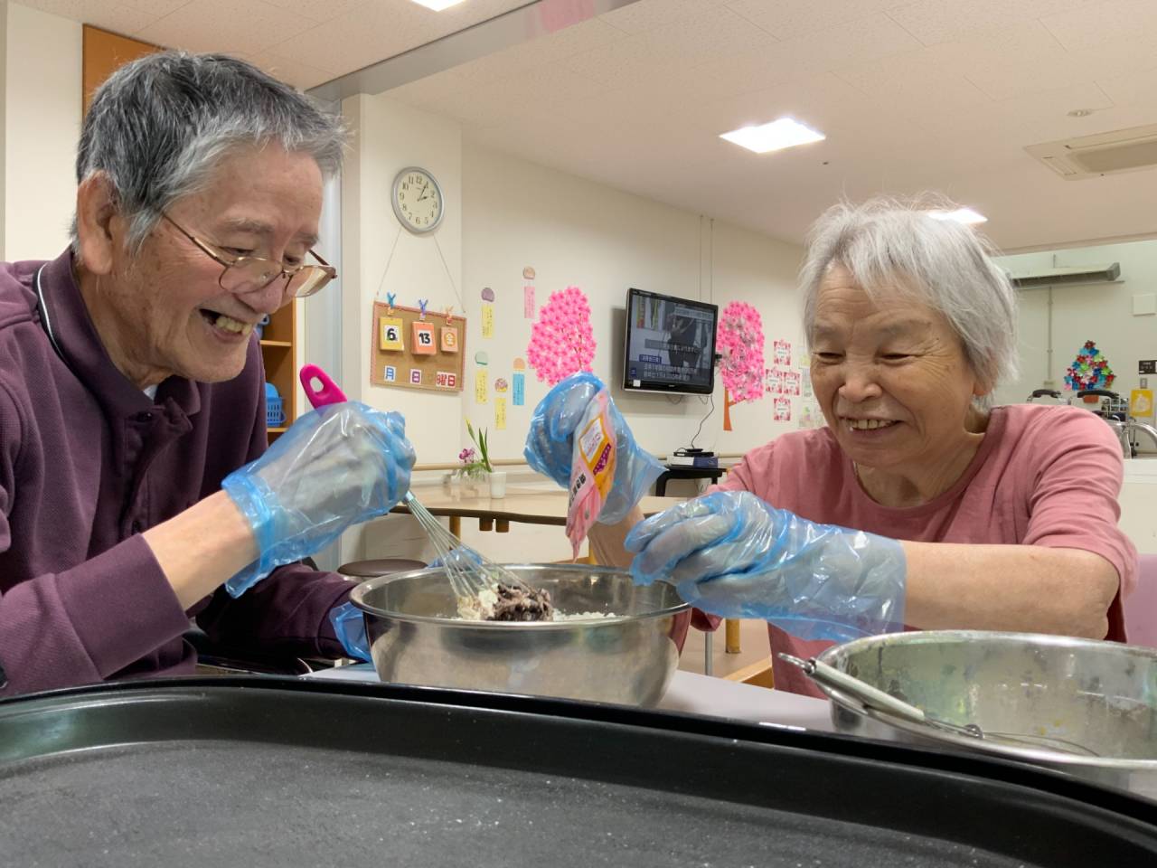 老健「蒸しパン🧁を作りました」 2025/06/20 おやつに蒸しパン🧁を作りました。 老健さわやか荘 ホットプレートを使い蒸しパン作りをしました。準備に時間がかかってしまい提供する時間が予定より遅くなりましたが無事に成功することが出来ました。 利用者様(3名)には材料を混ぜるなど準備を一緒にしました。会話をしながら作り楽しんで頂けたと思います。 食べた後には「甘すぎずでちょーど良かった」「美味しかったで」と言って頂くことができました。また一緒に作れるものを提案し気分転換に繋げていけたらなぁと思います。 (令和7年6月13日 ABユニット実施) さわやか荘(老健)