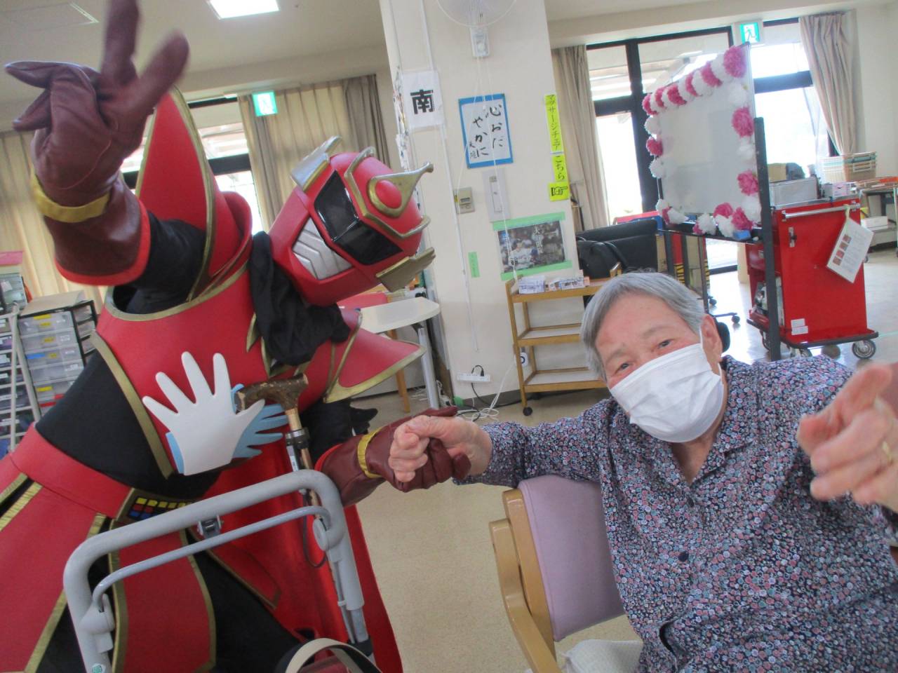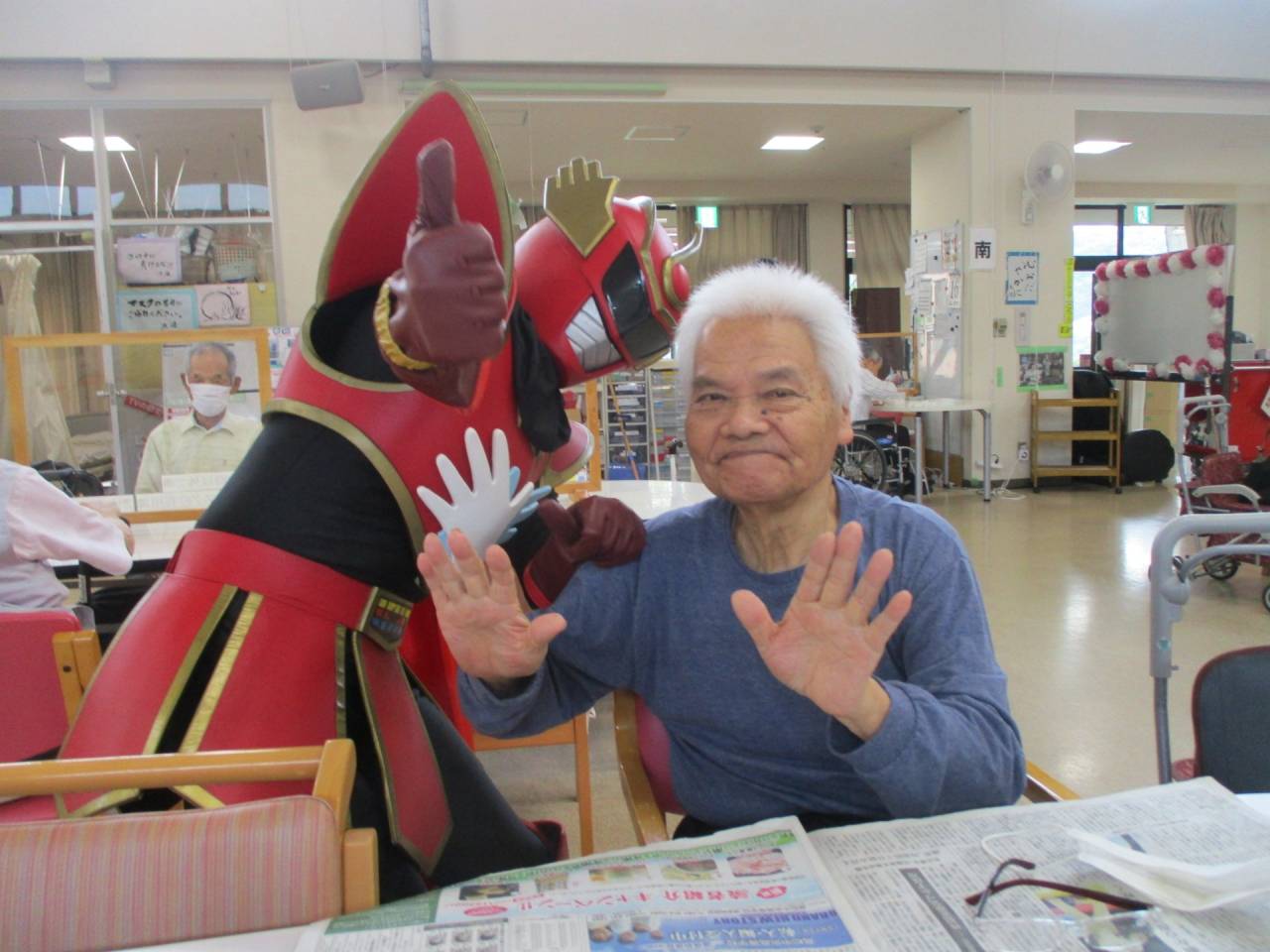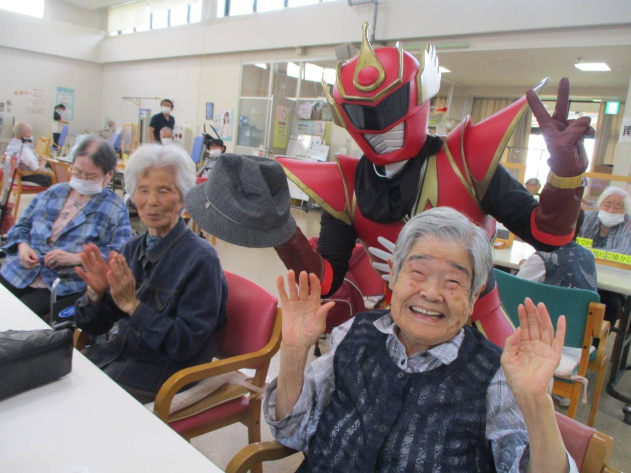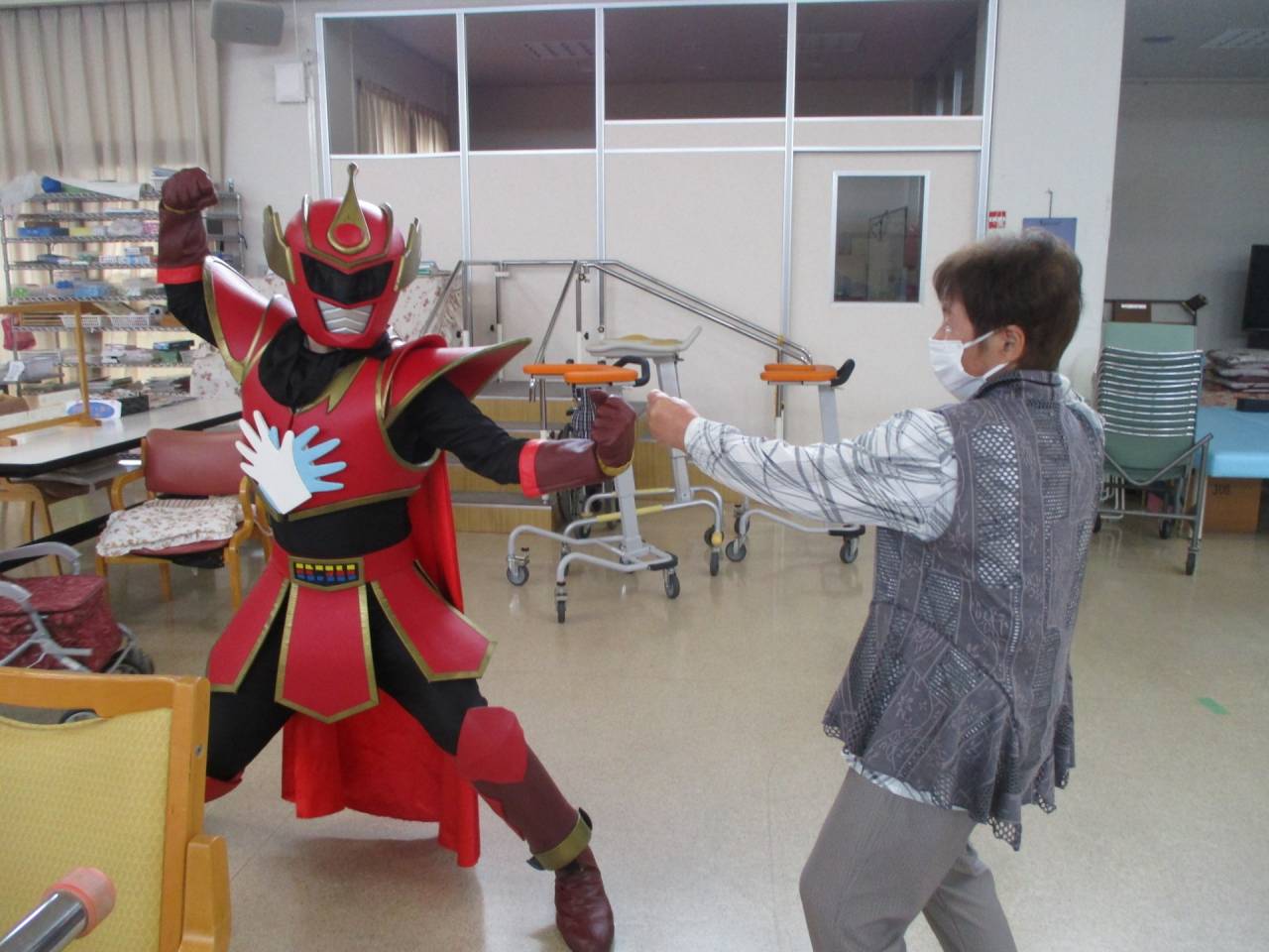 通所リハ「👍てぶくろマン参上!!」 2025/07/19 ✋てぶくろマン 6月 お隣の東かがわ市から、「てぶくろマン」が来てくれました!! 記念撮影や一緒に体操もしました。てぶくろマンはとても元気でしたが、利用者様も負けないくらい元気でした!!サービス精神旺盛なヒーローでした。疾風のように現れて、疾風のように去っていきました。ありがとう、てぶくろマン!また逢う日まで!👋 ✊てぶくろマン 👌てぶくろマン 👍てぶくろマン 👆てぶくろマン 👏てぶくろマン 👊てぶくろマン 👆てぶくろマン」 👋てぶくろマン 👐てぶくろマン 👍てぶくろマン ✋てぶくろマン 通所リハビリテーションセンター(デイケア)