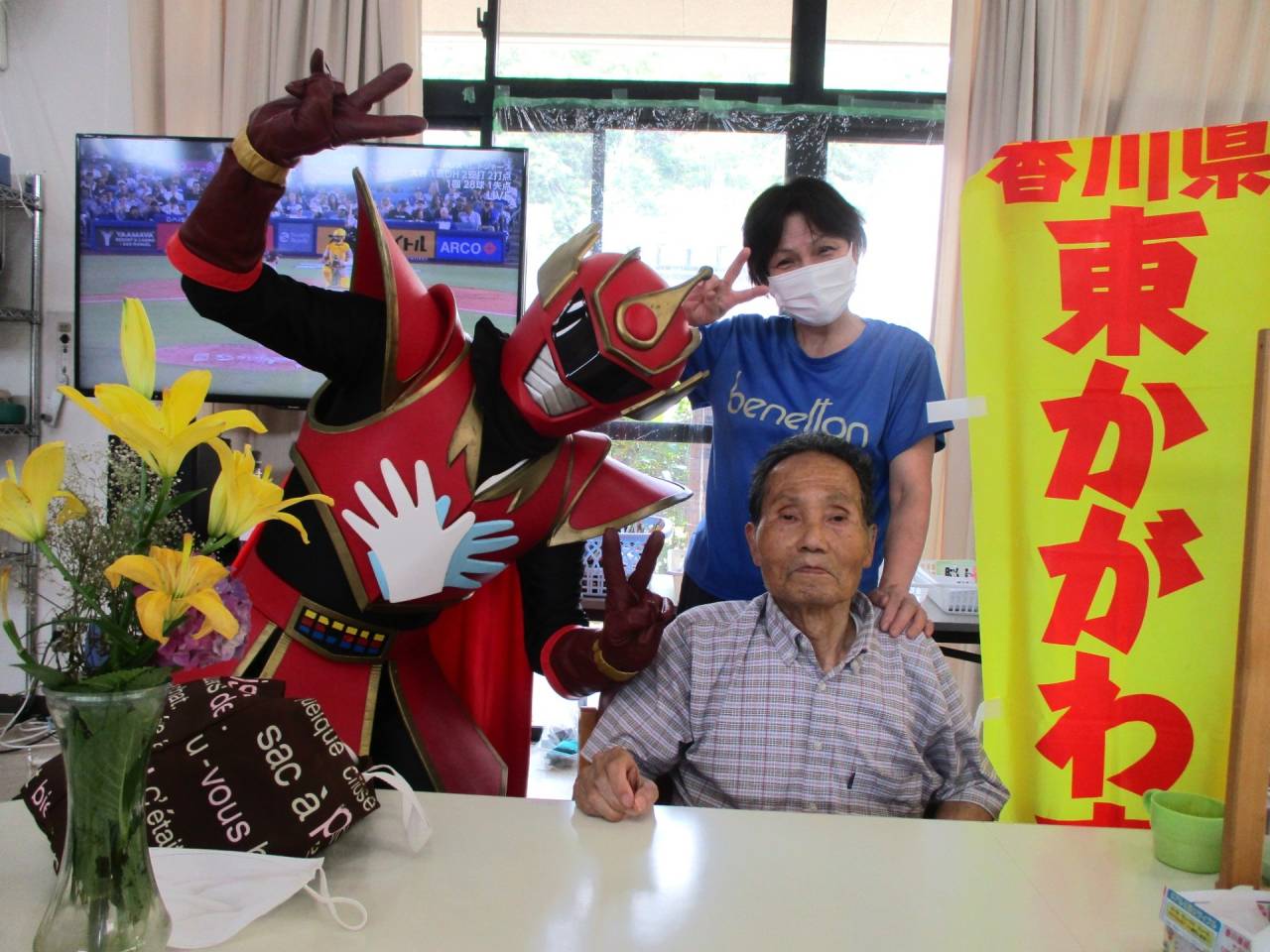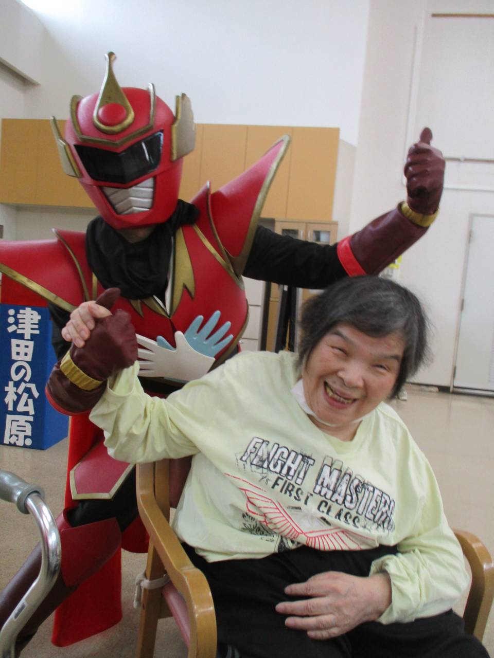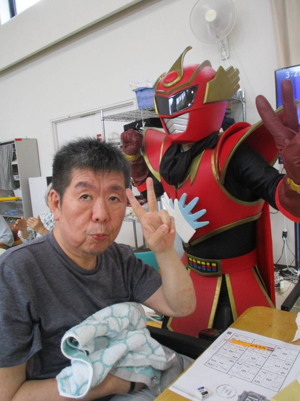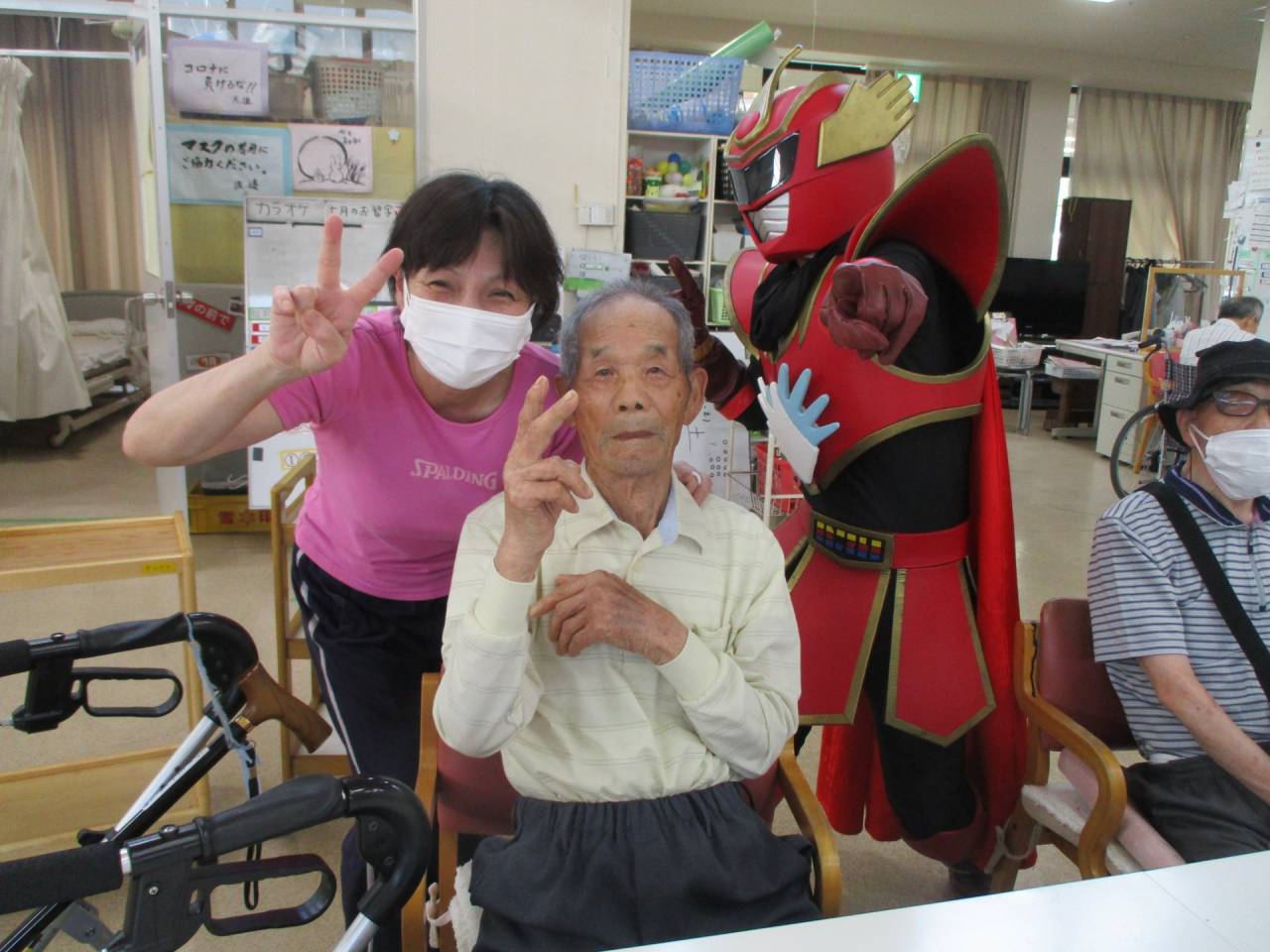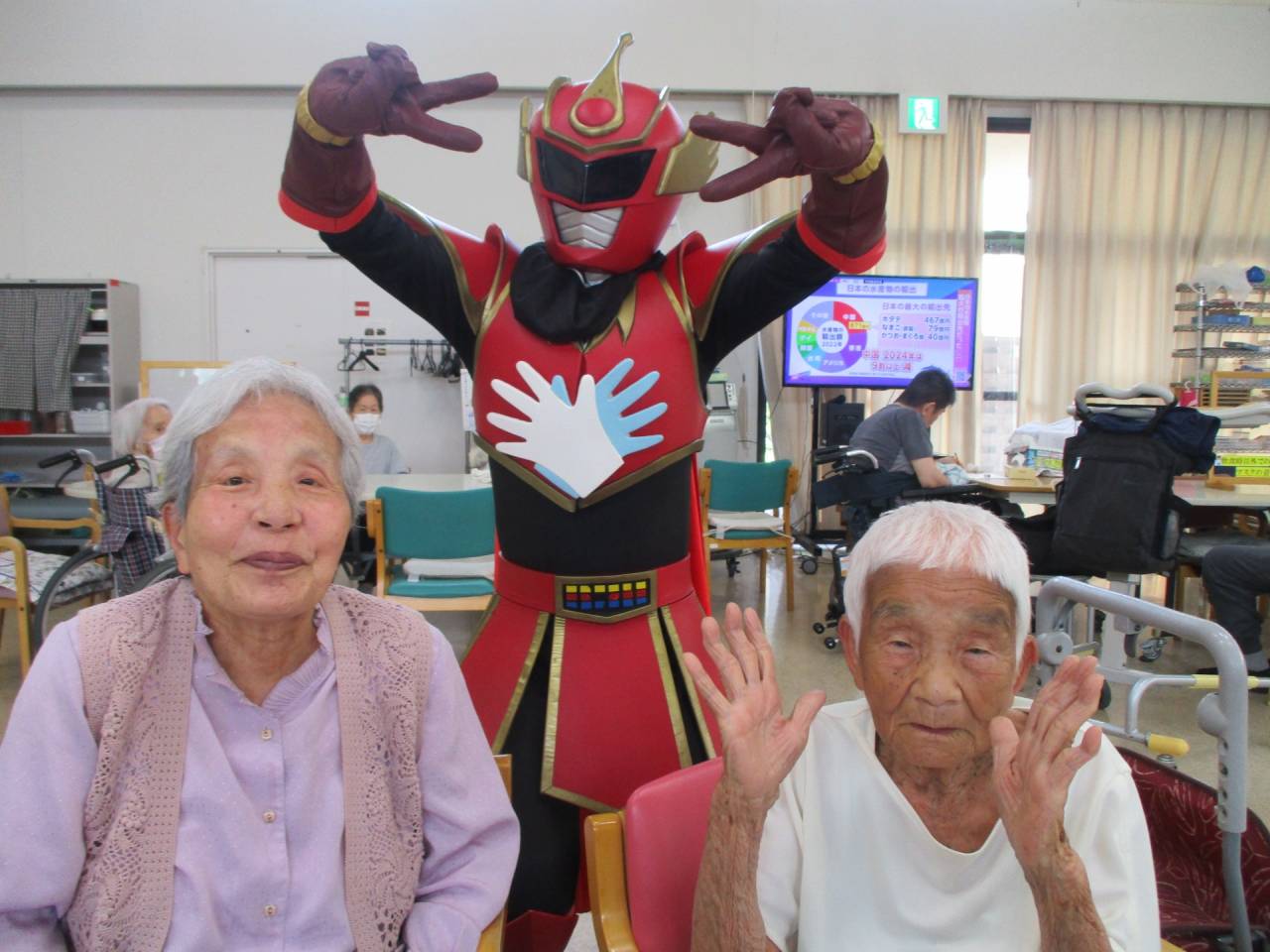 通所リハ「👍てぶくろマン参上!!」 2025/07/19 ✋てぶくろマン 6月 お隣の東かがわ市から、「てぶくろマン」が来てくれました!! 記念撮影や一緒に体操もしました。てぶくろマンはとても元気でしたが、利用者様も負けないくらい元気でした!!サービス精神旺盛なヒーローでした。疾風のように現れて、疾風のように去っていきました。ありがとう、てぶくろマン!また逢う日まで!👋 ✊てぶくろマン 👌てぶくろマン 👍てぶくろマン 👆てぶくろマン 👏てぶくろマン 👊てぶくろマン 👆てぶくろマン」 👋てぶくろマン 👐てぶくろマン 👍てぶくろマン ✋てぶくろマン 通所リハビリテーションセンター(デイケア)