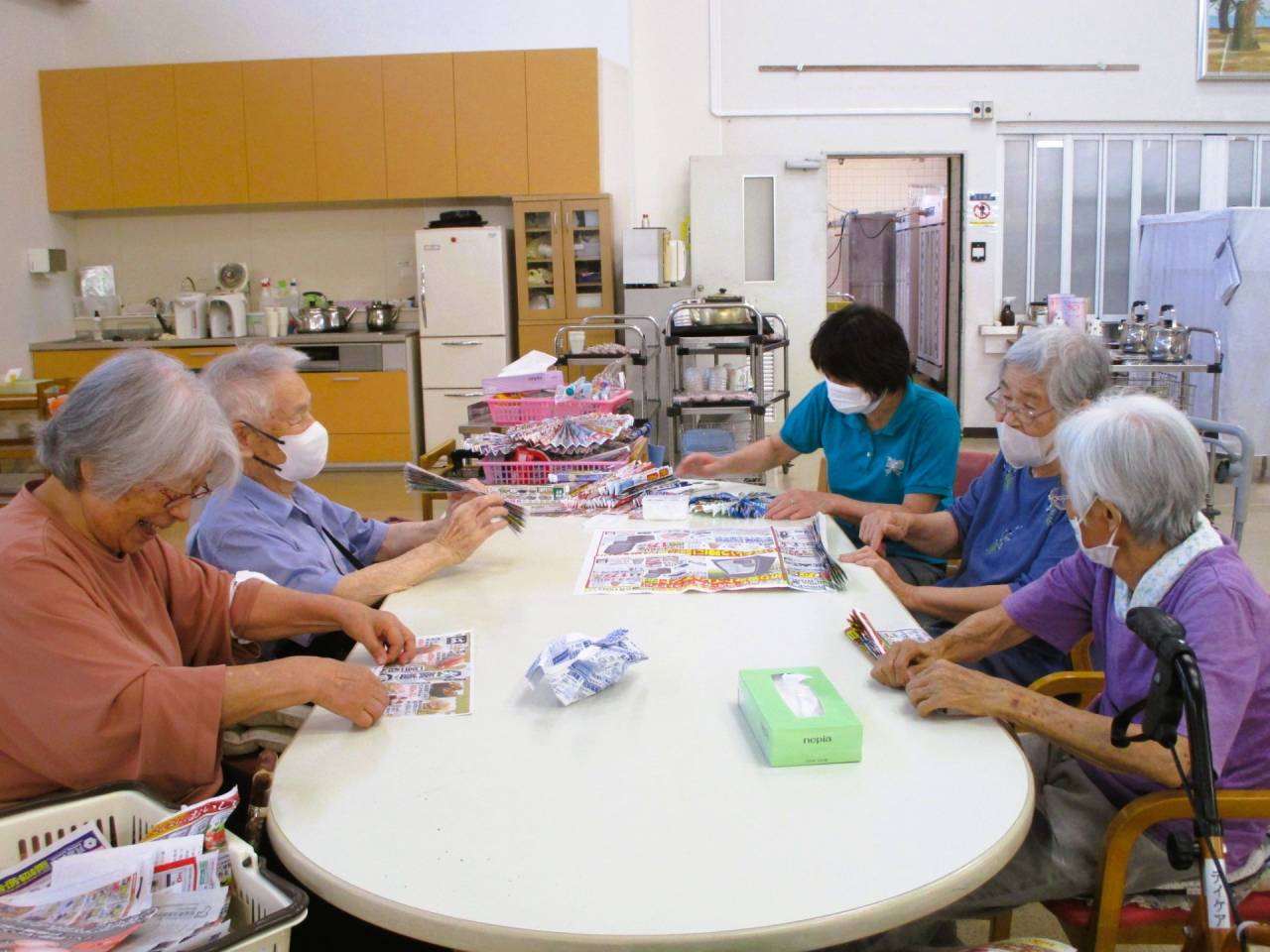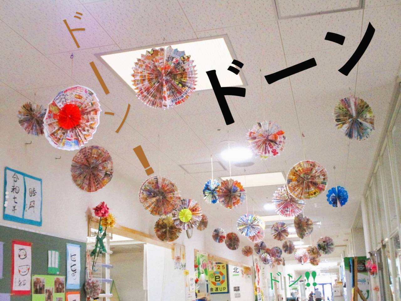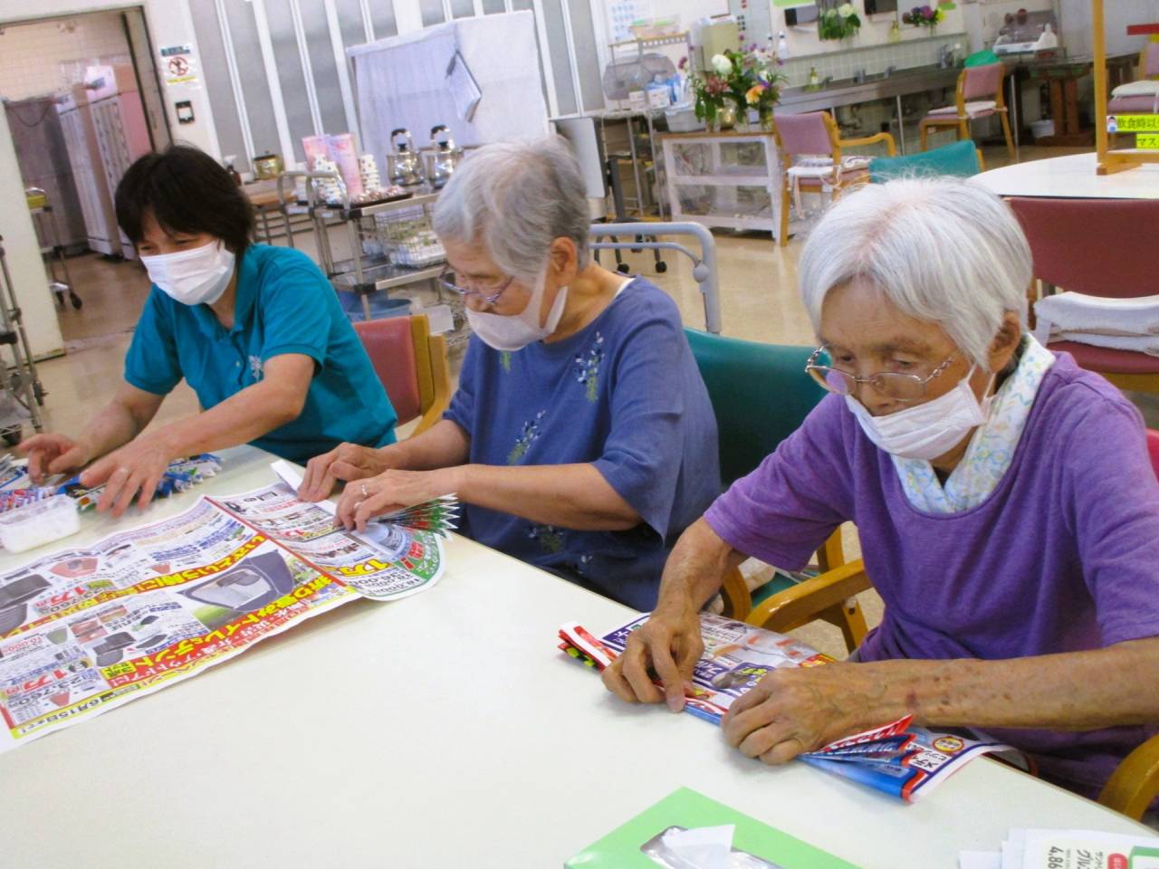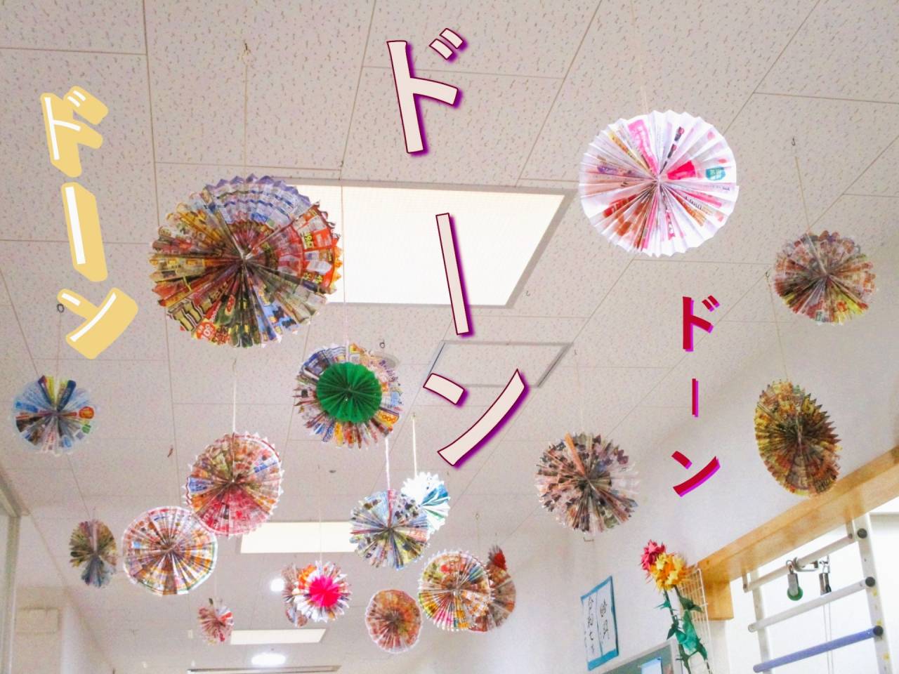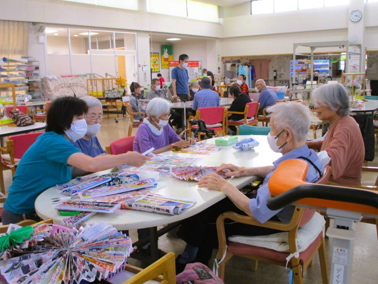 通所リハ「🎆花火大会🎆」 2025/08/10 大輪の花 ✂制作・・ 日本の夏 デイケアの夏 チラシや折り紙を使って、花火に見立てた作品を作りました。沢山作って廊下の天井に吊るしています。ご利用者様、ご家族様、職員も、少しでも楽しんで頂ければ嬉しく思います。花火職人一同 花火制作中・・・ 花火職人の皆様 チラシをジャバラに折って、繋げて円にしました。 通所リハビリテーションセンター(デイケア)