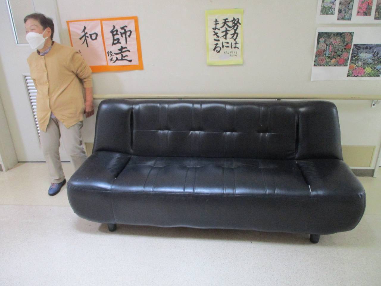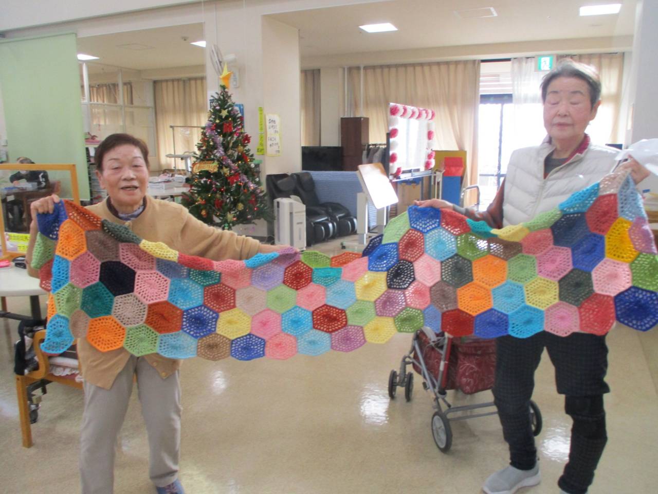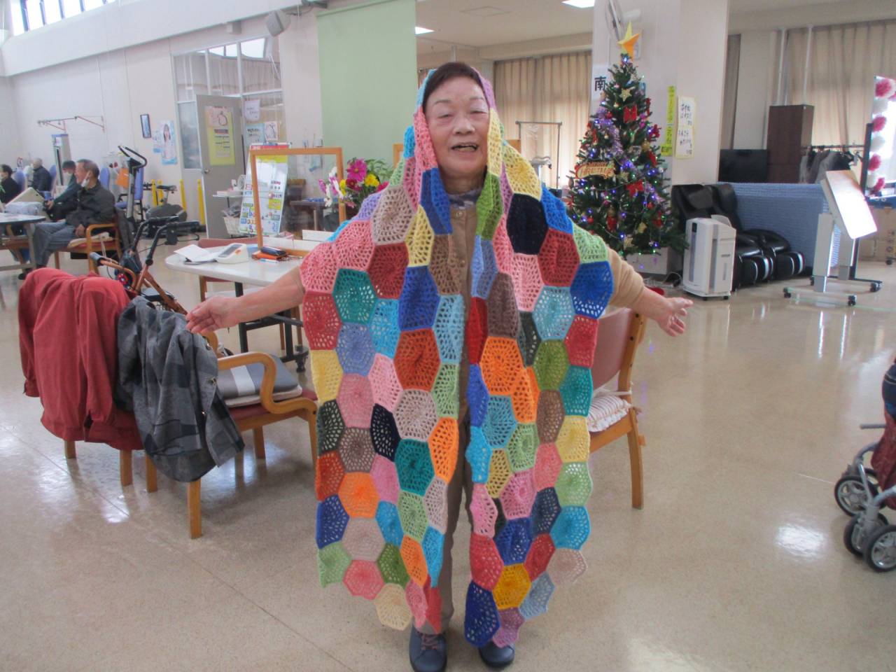 通所リハ「続・チャレンジ自慢」 2025/12/10 利用者様の作品 通所リハビリ 利用者様が家に残っている毛糸を手編みして、施設のソファーの敷物を作って下さいました。六角形の小さな編み物をつなぎ合わせて一枚の敷物にしています。数か月かかったそうです。 似合うでしょ? 通所リハビリ お茶目な一面もお持ちの利用者様です。廊下が明るくなりました。ありがとうございました。感謝🌟 通所リハビリテーションセンター(デイケア)