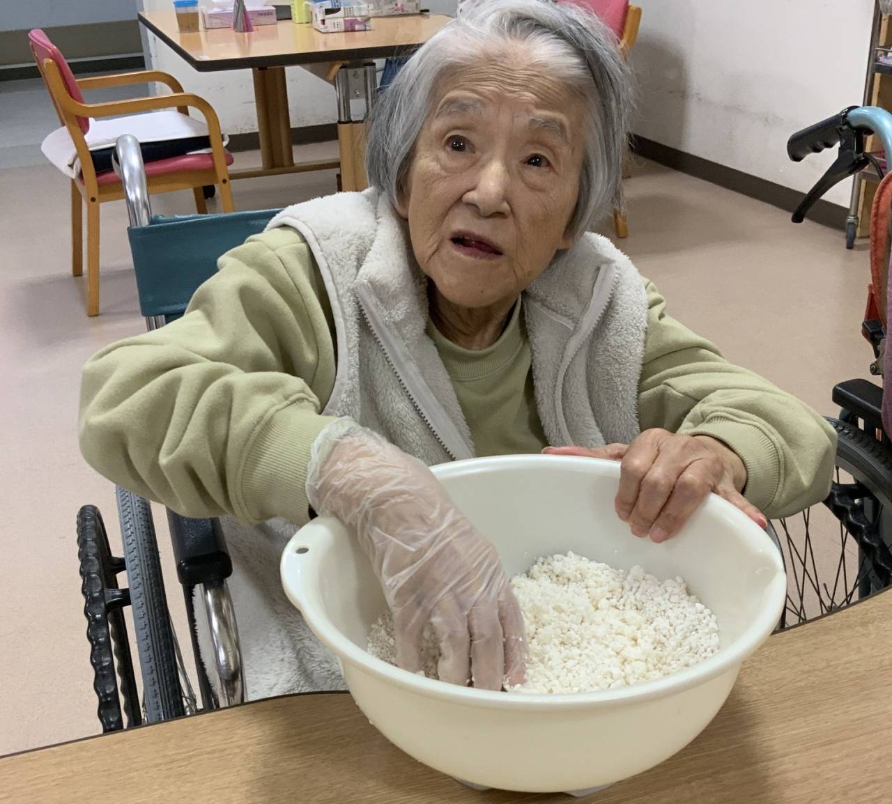 老健「おやつレク」 2025/12/15 白玉ぜんざいを作りました。 老健さわやか荘 白玉は、利用者様と一緒に粉からこねて作り、職員が作成したぜんざいに白玉を入れて、 利用者様に提供しました。 白玉の硬さの具合やぜんざいの甘さ加減は利用者様に好評で、皆様美味しいと喜ばれていました。 (令和7年12月13日土曜日 CDユニット実施) さわやか荘(老健)