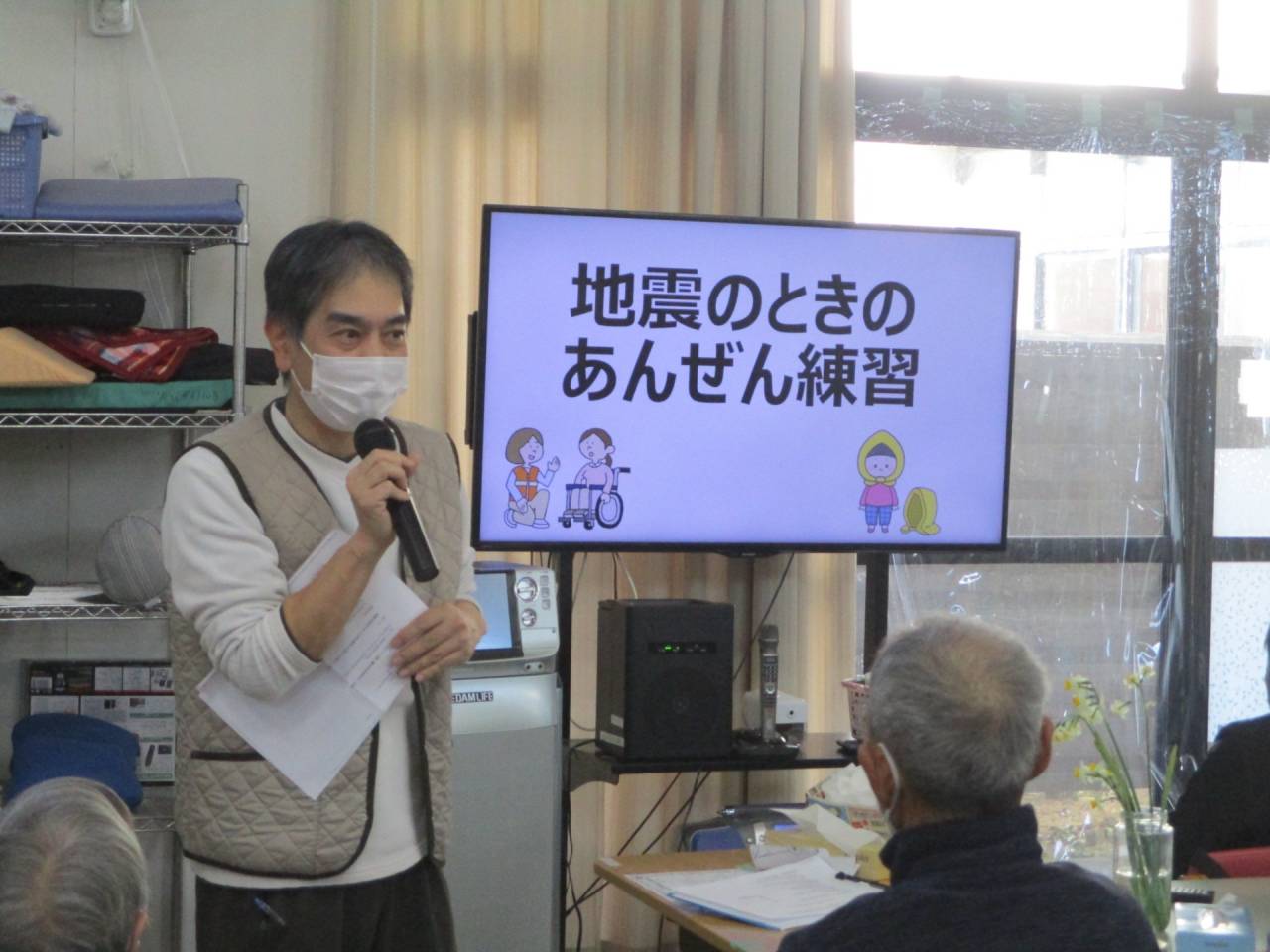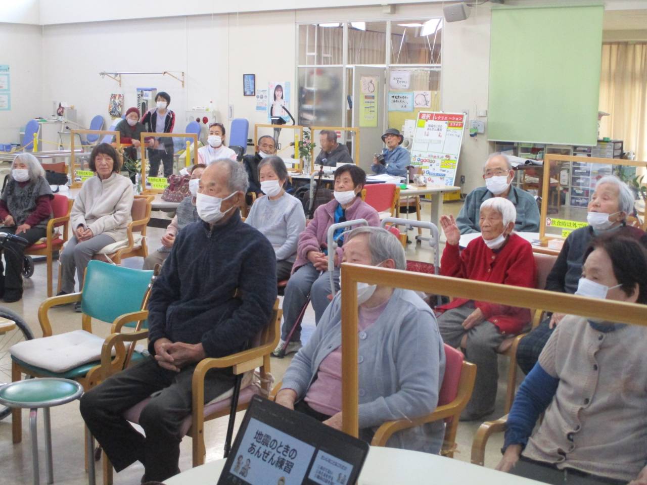 通所リハ「地震の時の安全練習」 2026/03/08 防災訓練 通所リハ 地震が起こった時の対応について、座学と避難訓練をしました。先ず動画を視聴してから、職員が説明を行いました。 防災訓練 動画「防災訓練の心がまえ(千葉県公式PRチャンネル)」 避難訓練では、どんなことに気をつければいいでしょうか? 防災訓練 通所リハ 地震発災時は、自分の身を守る(頭を守る)→揺れている間は動かない→職員の言葉を聞く。皆様真剣に話を聴いて下さいました。 防災訓練 通所リハ 座学をした後は、利用者様と職員が今いる場所から避難する訓練を行いました。 通所リハビリテーションセンター(デイケア)