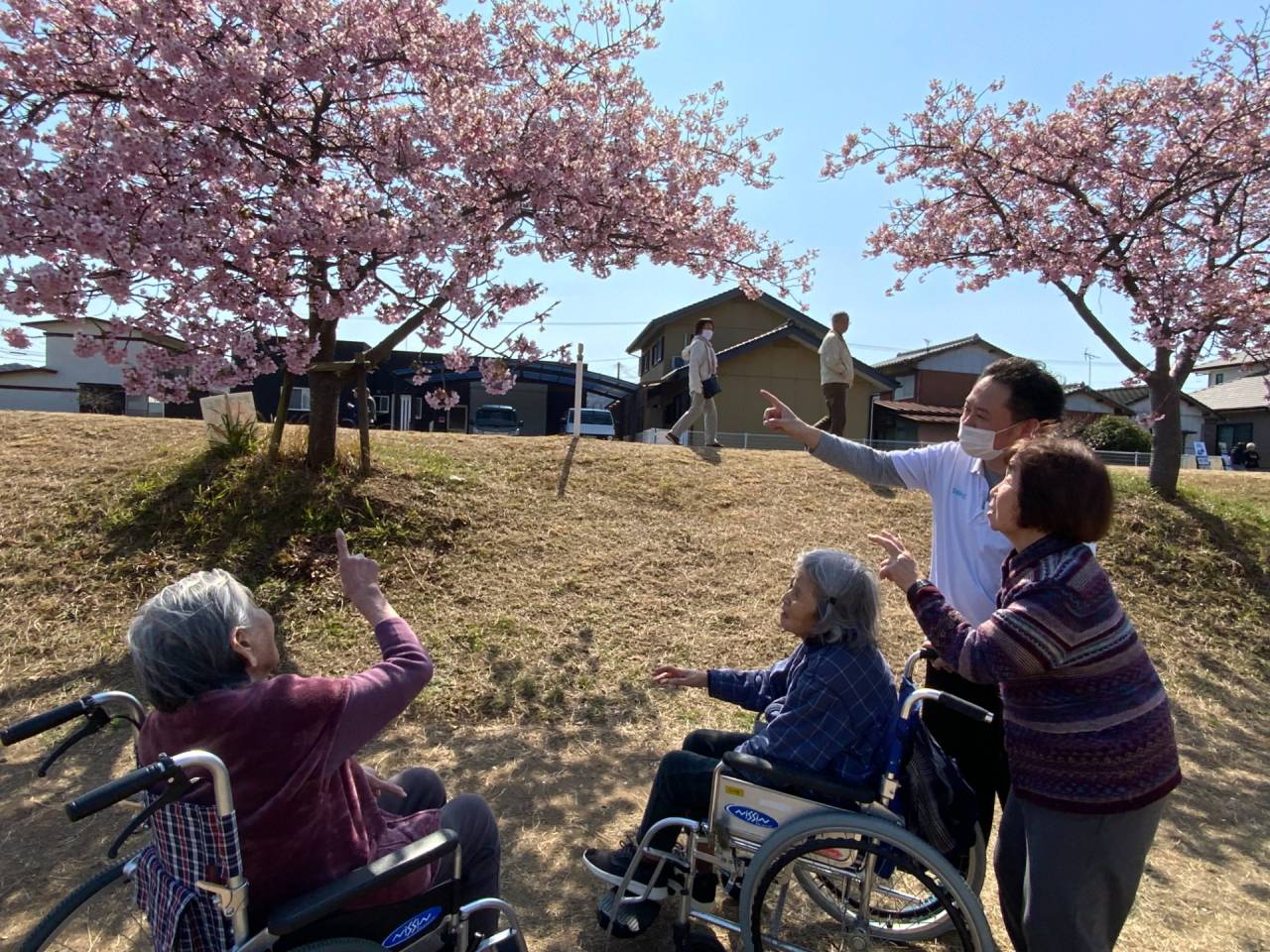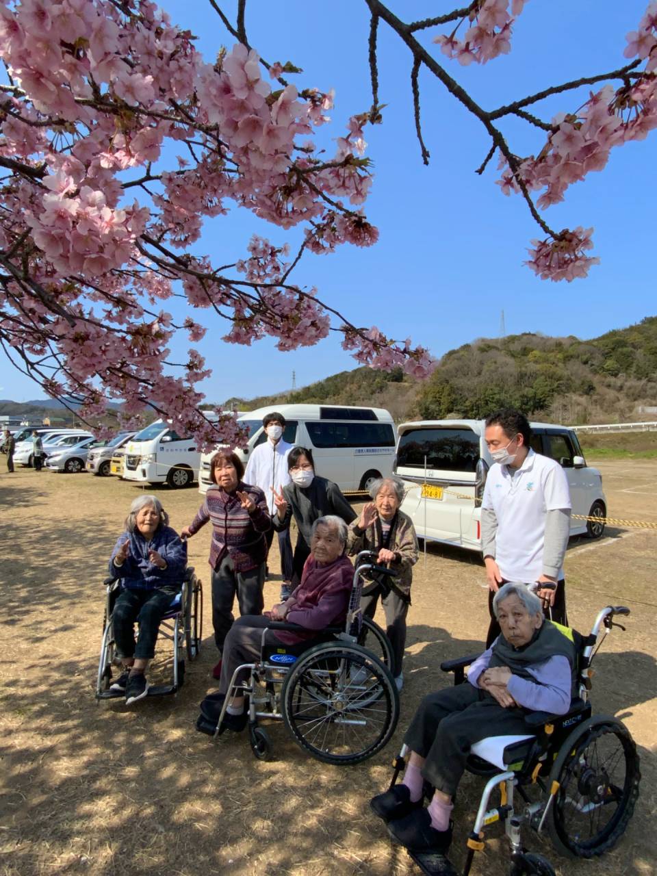 老健「河津桜🌸」 2026/03/16 湊川の河津桜🌸をみにいってきました。 老健さわやか荘 車3台で利用者様13名、職員5名の大人数でお花見🌸に行ってきました。 2日前に行かれた利用者様が8分咲きくらいやったと言われており当日は満開でした✨ 行くまでの道中でもウキウキとされており、現地に到着してからは車中から「まぁ!きれいに満開やなぁ😀」と喜んでいただけました。また、数名は車から降りて桜に触れる距離で観賞されました。 そのあと皆さんリンゴジュース🥤を飲んで一息ついてからさわやか荘に帰ってきました。 (令和8年3月12日 ABユニット実施) さわやか荘(老健)