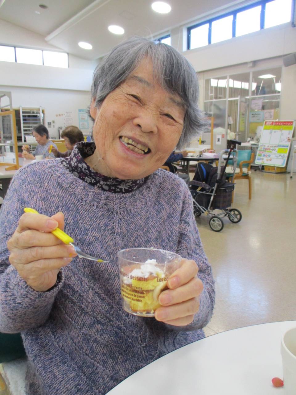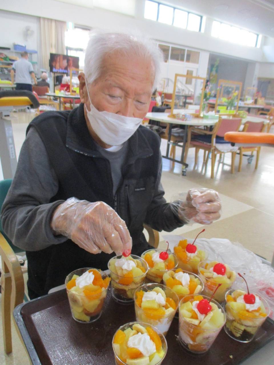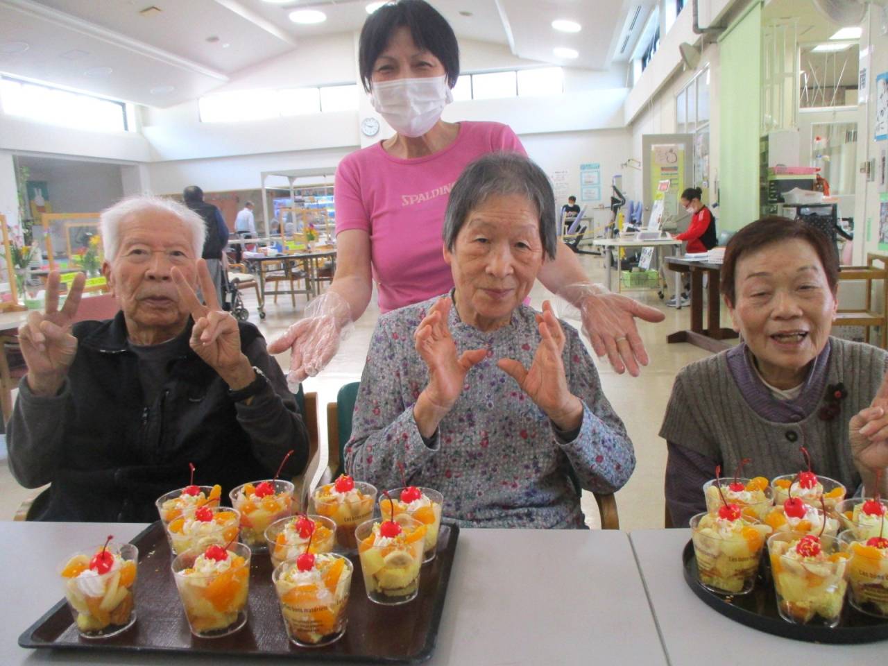 通所リハ「💕フルーツパフェ作り」 2026/04/22 「男子も厨房に入るべし!」 通所リハ フルーツパフェを作りました。男性の利用者様にもご参加いただいております。缶詰を開けるのは力がいるので助かります。自立支援介護を進めるために、洗濯物たたみ、コップやおしぼり・昼食の準備、洗い物等、「お手伝いしてもかまんよ。」という利用者様には積極的にご参加いただいています。 おやつ作り 通所リハ 美味しくできたよ!ピース! 通所リハビリテーションセンター(デイケア)